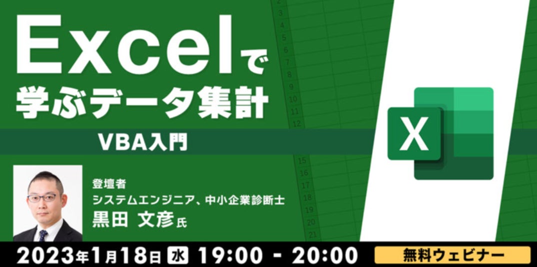 株式会社クリーク・アンド・リバー社(C&R社)は2023年1月18日(水)、日常的にExcelを使用し多くのデータを扱っている方を対象に、無料のオンラインセミナー「Excelで学ぶデータ集計~VBA入門~」を開催いたします。