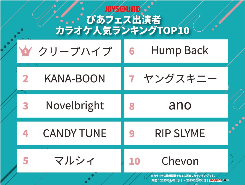 さらに、「PIA MUSIC COMPLEX 2025」の豪華出演陣の中から、今、カラオケで最も歌われているアーティストのランキングTOP10を発表します。フェスの熱気そのままに、会場だけでなくカラオケでもファンが熱唱している注目のアーティストを一挙紹介します。