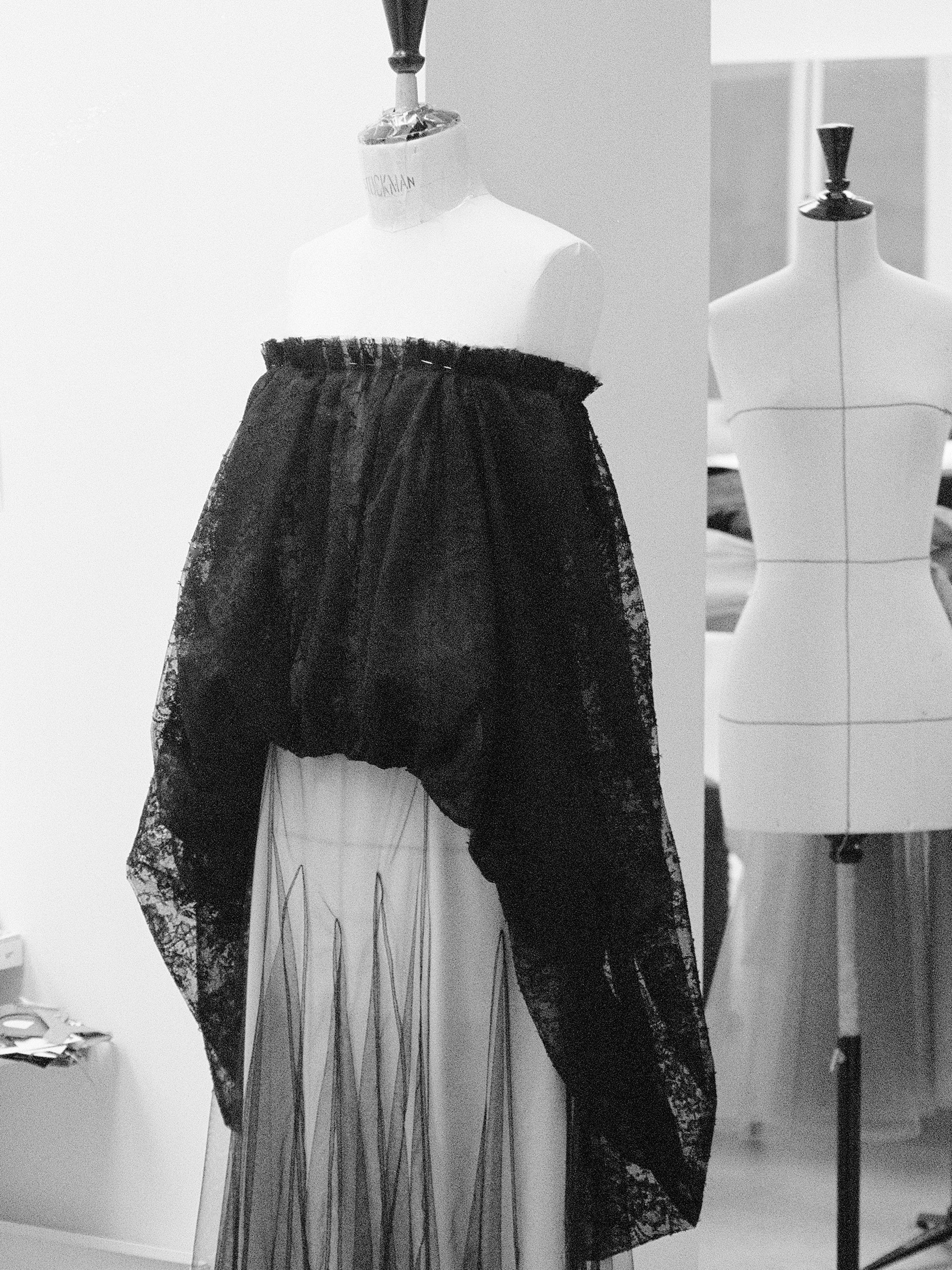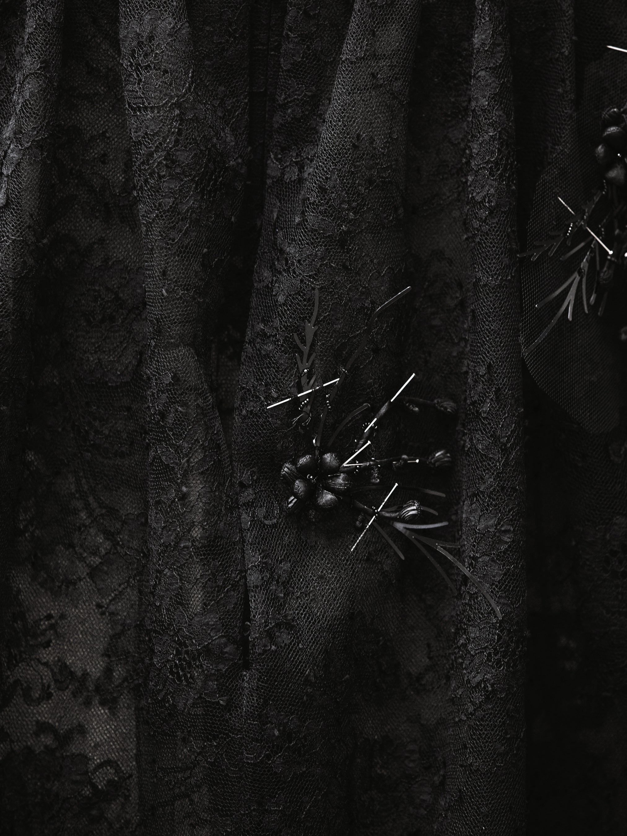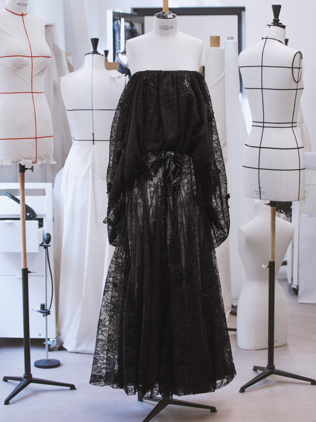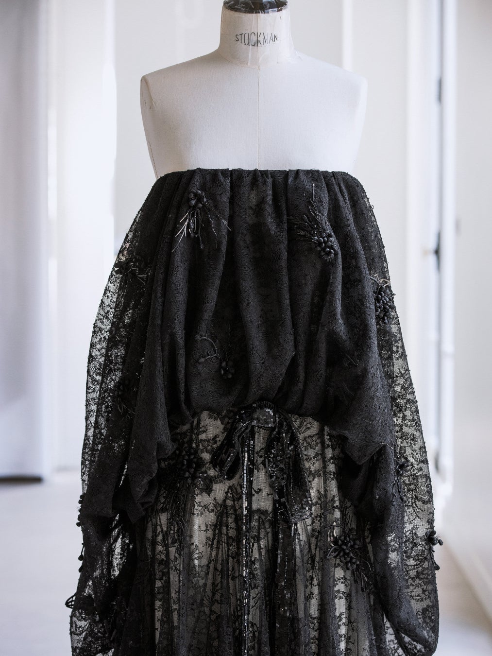 オデッサ・エイジオンは、ブーケのレース刺繍があしらわれたのブラックストラップレスドレスを纏いました。