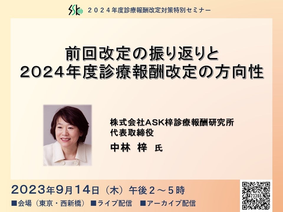 「前回改定の振り返りと2024年度診療報酬改定の方向性」と題して、株式会社ASK梓診療報酬研究所 代表取締役 中林 梓氏によるセミナーを2023年9月14日(木)に開催!!