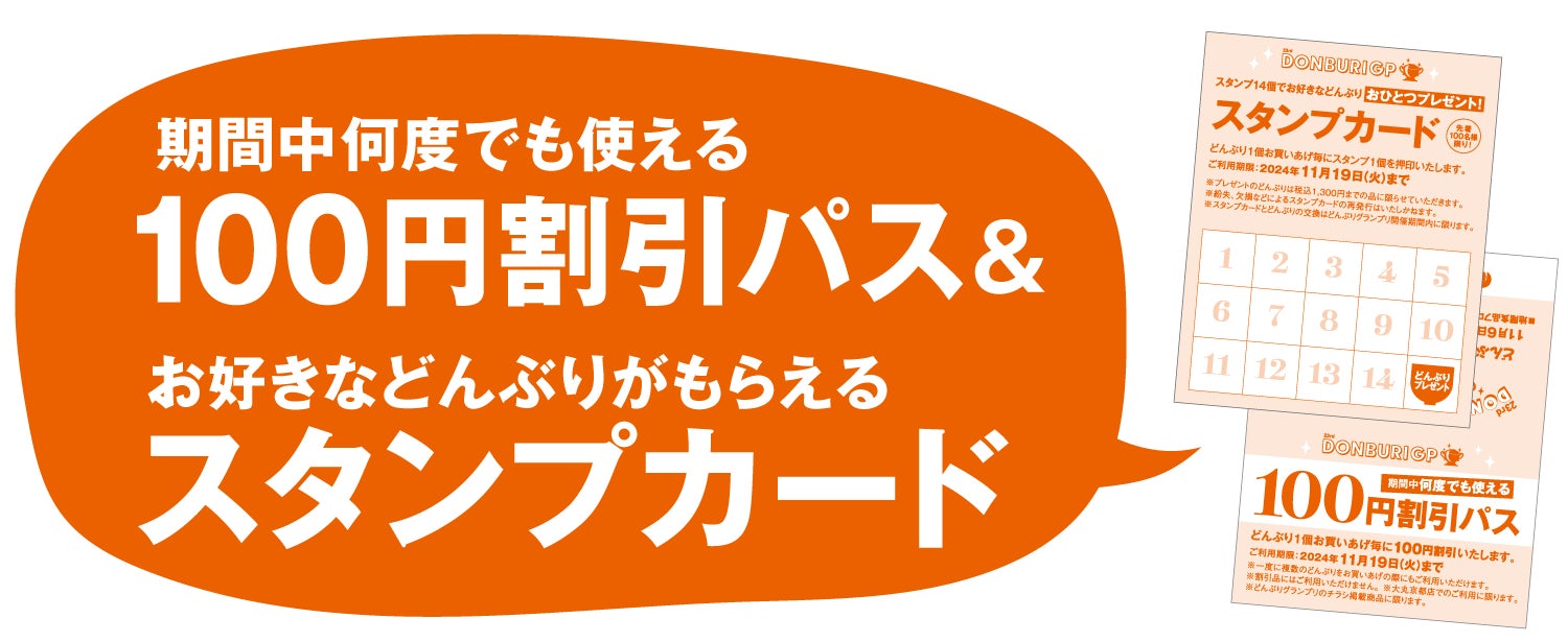 期間中どんぶりをお買いあげいただくと、次回から使える100円割引パス&スタンプカード1枚をお渡しします。2回目以降のお買いあげ時にパスを見せるだけでどんぶり1個につき100円割引いたします。また裏面のスタンプカードにはお買いあげ個数のスタンプを押印(初回お買いあげのスタンプも押印)。スタンプ14個をためられた先着100名様にお好きなどんぶり(税込1,300円まで)をおひとつプレゼントします。
