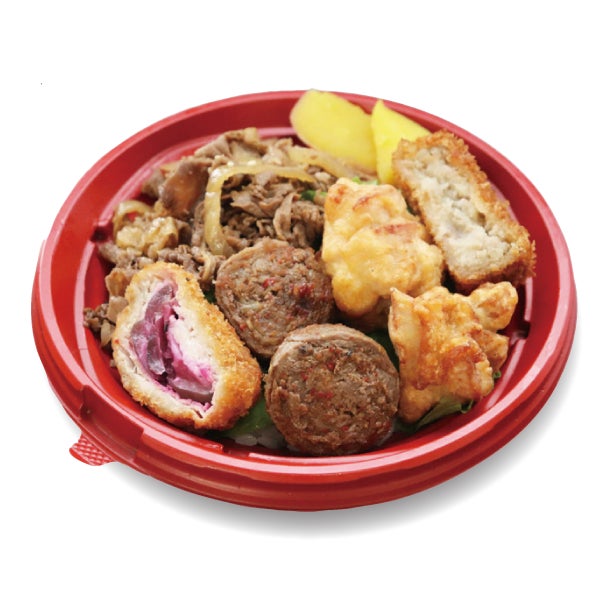 コロッケ、から揚げ、ロールステーキ、しば漬け巻きカツを一度に楽しめる丼。