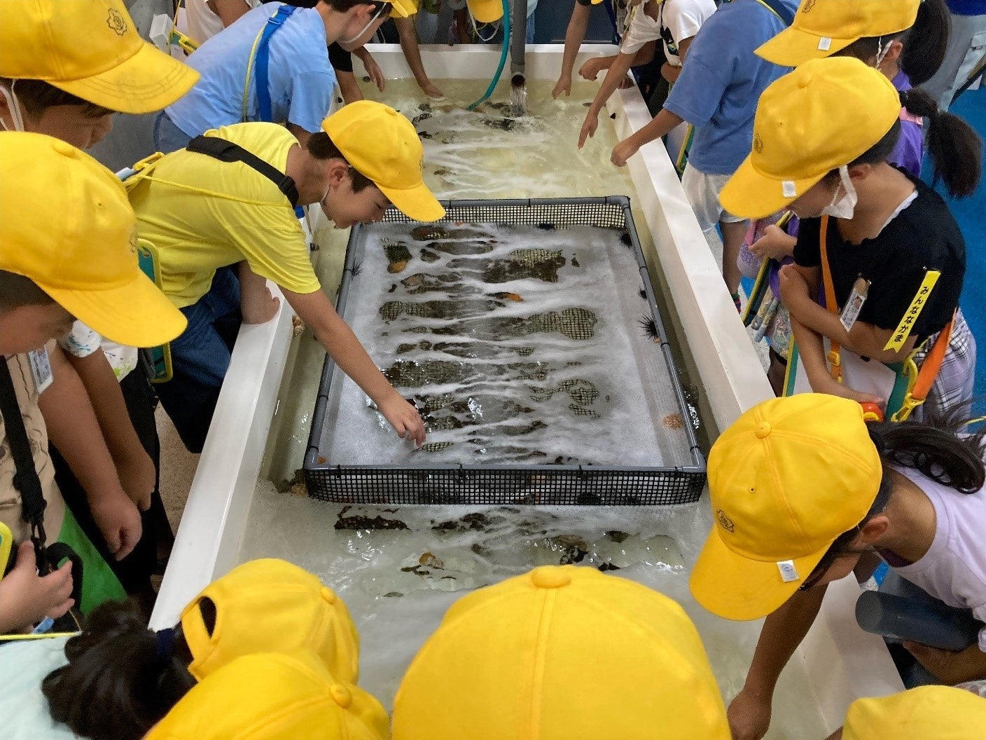 今回は藻場の消失の現状や原因について、生きたムラサキウニを手に取りながら学んだ事前学習の経験を踏まえ、ウニだけに限らない泊の海の生き物の多様性を感じてもらうために、鳥取県栽培漁業センターの協力のもと、同センターでの体験学習「①地域の海の生き物とのふれあい・勉強会」「②魚の餌やり体験」を実施しました。