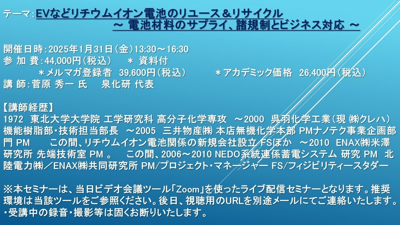先端技術情報や市場情報を提供している(株)シーエムシー・リサーチ(千代田区神田錦町: https://cmcre.com/ )では、 各種材料・化学品などの市場動向・技術動向のセミナーや書籍発行を行っておりますが、 このたび「EVなどリチウムイオン電池のリユース&リサイクル ~ 電池材料のサプライ、諸規制とビジネス対応 ~」と題するセミナーを、 講師に菅原 秀一 氏 (泉化研 代表)をお迎えし、2025年1月31日(金)13:30より、 ZOOMを利用したライブ配信で開催いたします。 受講料は、 一般:44,000円(税込)、 弊社メルマガ会員:39,600円(税込)、 アカデミック価格は26,400円(税込)となっております(資料付)。