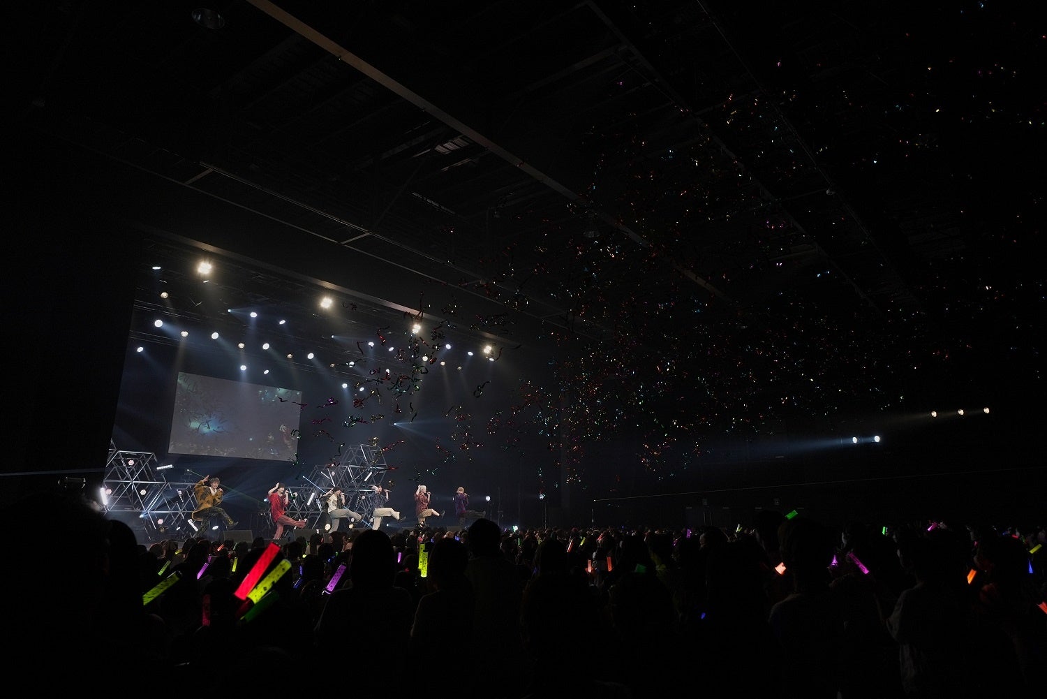 最新ビジュアルの衣装を身に着けたメンバーたちのシルエットがステージに浮かび上がり始まった本ライブ。メンバーたちは「声、出して行くぞ!」など会場を煽り、7m!n史上最高難易度のダンスナンバー『ヤミツキVIBE』からスタート。『ヤミツキVIBE』でキレキレのダンスと歌を披露したあとは『HANAZIBOO!』、『マイクテスト』と続けた。『マイクテスト』ではメンバー6人がサイン入りの紙飛行機を会場に飛ばし、一番遠くに飛ばすことができたメンバーが『マイクテスト』の曲中の決めセリフを担当するという演出が。飛行機を一番遠くへ飛ばしたのは白金倫太郎。会場が静まった中、白金が「俺と結婚しよう!」と口にすると、会場中から黄色い悲鳴があがる。そして、『OOPARTS』をツアーオリジナルの編曲とダンスでパフォーマンス。冒頭4曲のダンスナンバーで会場を一気に盛り上げた。