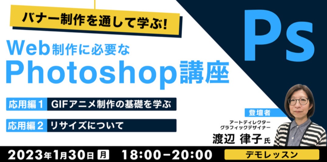 今回は、「バナーづくりの基礎知識」「文字」「配色」を解説した基礎編、「レイヤー効果」「マスク」「調整レイヤー」を解説したイメージ編、「レタッチ」「画像合成」を開設した写真素材編に続き、応用編の第1回と第2回を同日開催。「GIFアニメ制作の基礎」「リサイズ」についてわかりやすく解説いたします。初心者の方はもちろんのこと、Web制作ツールの基礎力を高めたい方、バナー制作を学びたい方にもおすすめの内容です。ご興味をお持ちの方は、お気軽にご参加ください。