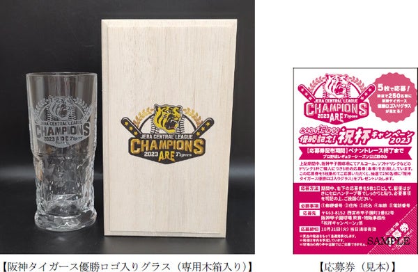 キャンペーン開催期間中、阪神甲子園球場(売店・売り子)にてアルコール、ソフトドリンクなどのドリンクをお買い上げの方に「応募券」をもれなくお渡しします。応募券を5枚集めてご応募いただいた方の中から抽選で250名様に「阪神タイガース優勝ロゴ入りグラス」をプレゼントします。
