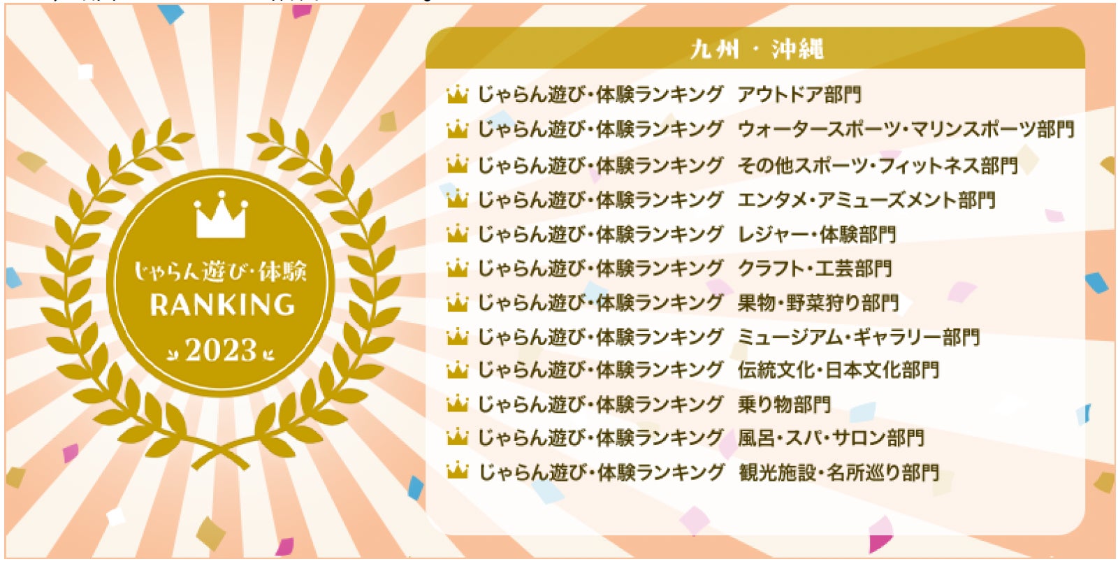 2023年、多くのお客さまから支持された遊び体験施設を表彰 「じゃらん遊び・体験ランキング」九州・沖縄ブロック発表