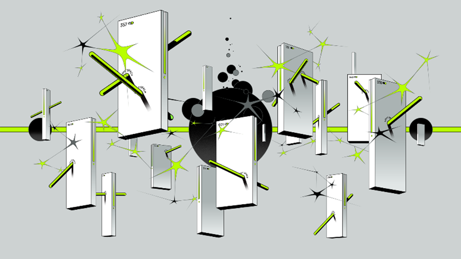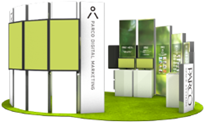 商業施設の未来を、デジタルの活用によって持続可能にしていくための研究所をイメージ。周囲に白い光を放つパネルを円形に配置し、ボーダーレスな未来を表現。人工的なパネルの内側では、人々が集う自然ある景色を思わせるグリーンがデジタル空間と融合しています。