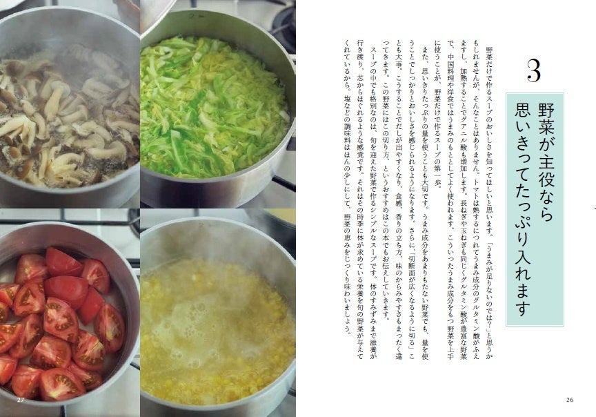 料理でいちばん大事なのは、素材のもつおいしさを十分に引き出すこと。素材ひとつひとつと向き合って、切り方、下処理をきちんとする。そうすることでうまみを引き出し、「きれいな味」の美味しいスープを作ることができます。
