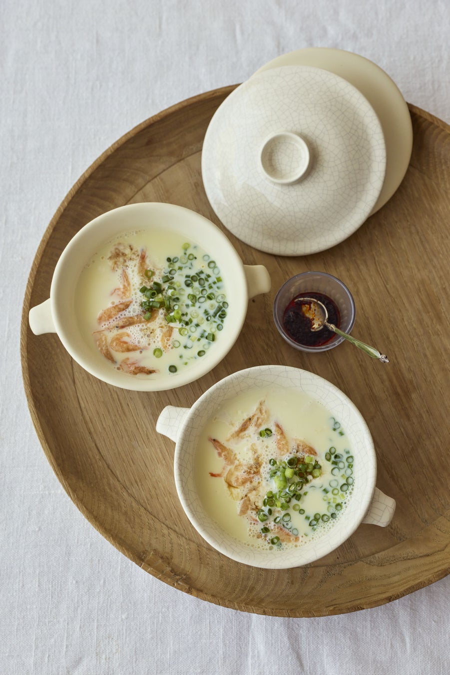 ザーサイと桜エビの入った豆乳のスープ。台湾の定番、鹹豆漿(シェントウジャン)。ウー・ウェンさんのオリジナルレシピは、とっても手軽にできて、味は本格的!パンを添えれば、栄養たっぷりの朝ごはんになります。