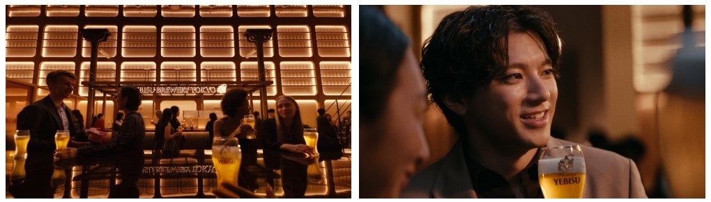 華やかなYEBISU BREWERY TOKYOの雰囲気の中でビールを美味しそうに飲む姿、ヱビスの世界観の中でのビールの輝きにも注目です。