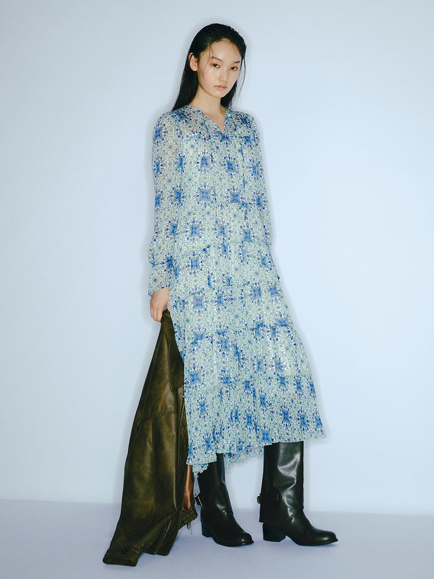 ラメ糸が入っているジャガード風のシアー生地にWilliam Morrisの特徴的な花モチーフの幾何柄をプリントし、ティアードとプリーツが華やかに見せてくれます。