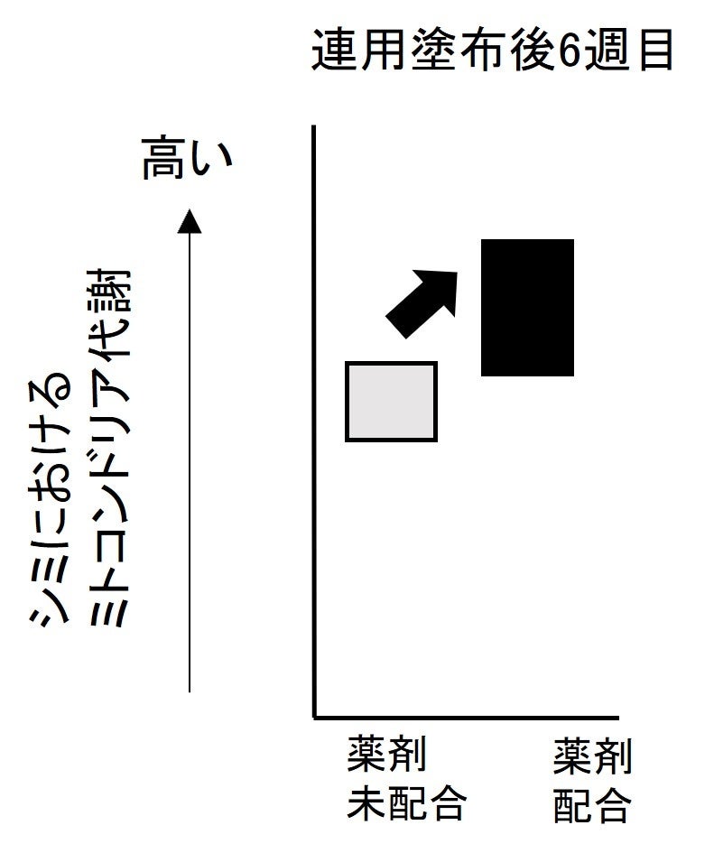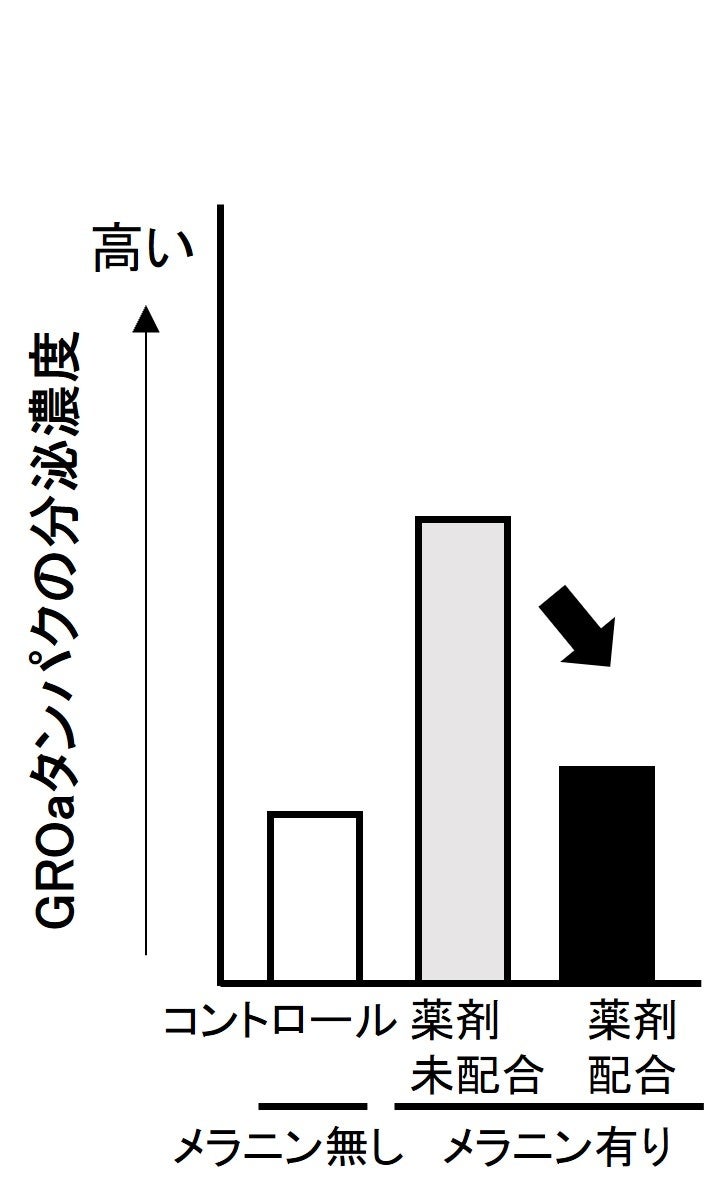 ヒトの皮ふで6週間の連用塗布を行った結果、資生堂独自のトリプル薬剤を配合した基剤において、シミにおけるミトコンドリア代謝が高まることを見出しました(図5)。細胞老化の主要な要因のひとつであるミトコンドリア活性低下を抑えるとともに、老化した細胞から分泌され、さらに細胞老化を悪化させるSASP因子※4 のひとつであるGROα※5 を抑制することが分かりました(図6)。