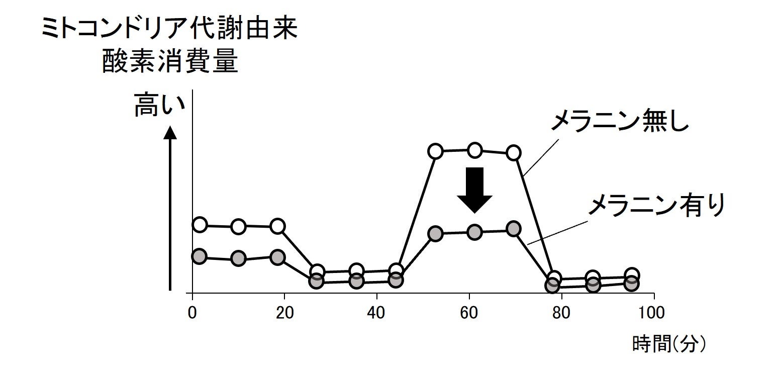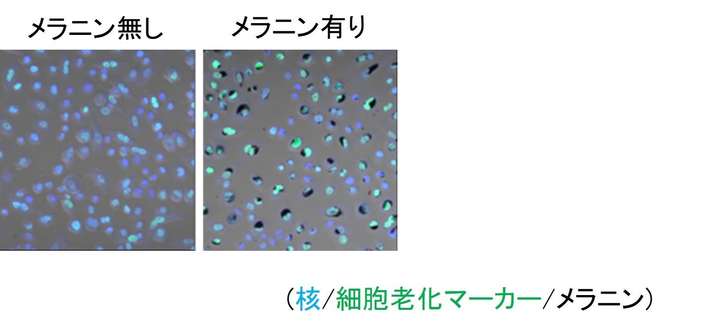 FLIMを用いた解析によって、生きたヒトの皮ふのシミ部位では、非シミ部位に比べて表皮細胞内のミトコンドリア代謝が低下していることが分かりました(図2)。また、過剰なメラニン蓄積が、このミトコンドリア代謝の低下を起こすことを確認し(図3)、さらに細胞老化も引き起こすことを明らかにしました(図4)。シミ部位では、メラニンの蓄積によってミトコンドリア代謝が低下し、細胞老化が生じることでシミが悪化すると考えられ、いわば、シミがシミを呼ぶ悪化根源があることを明らかにしました。