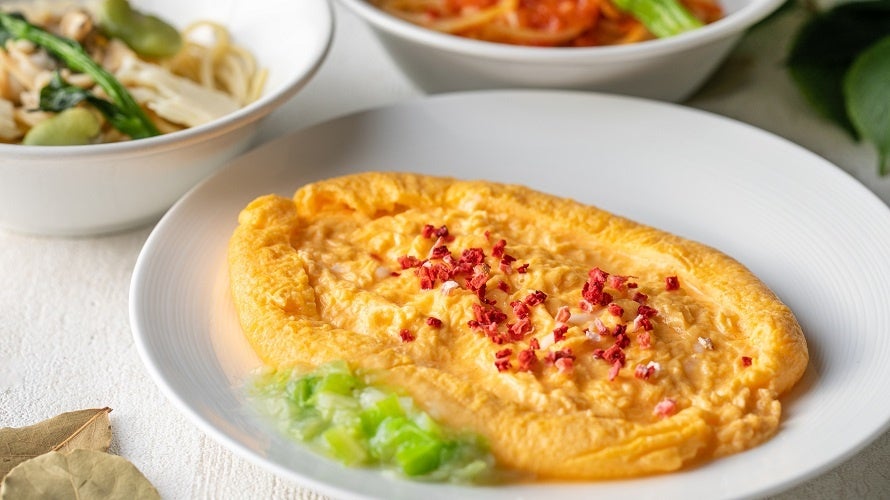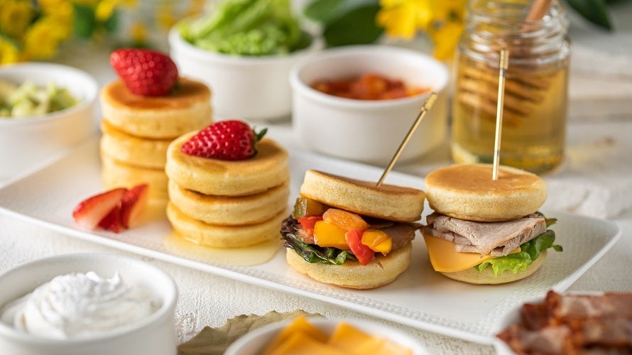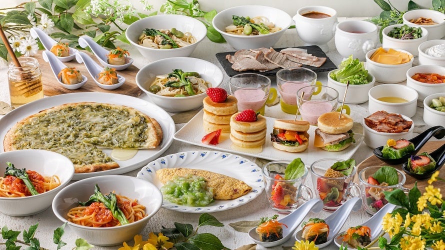 お食事では、パンケーキをハンズ代わりに約10種類のトッピングをご自身で組み合わせ、お好みの一品がお楽しみいただける“パンケーキバーガー”を中心に、キャベツのソースでお楽しみいただくオムレツや菜の花とそら豆がアクセントのパスタ、しらすをふんだんに使用したピザなど、春らしい軽食メニュー、約10品をご用意いたします。