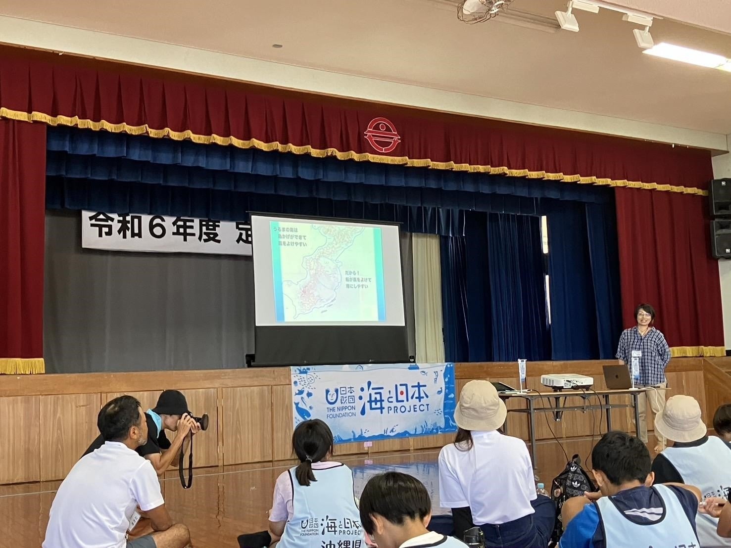 うるまの海ってどんな海なんだろう?「うるま」は方言で「サンゴ」を意味します。この島の人々が海の恵みに感謝し、4島それぞれに特色があることの導入の説明を受けました。これまでは、西海岸がサンゴ保全の中心となっていましたが、東海岸にあるうるま市にも海を保護していこうという動きがあることを知り、これからのプログラムに向けての予備知識として、豊かなうるまの海を学びました。
