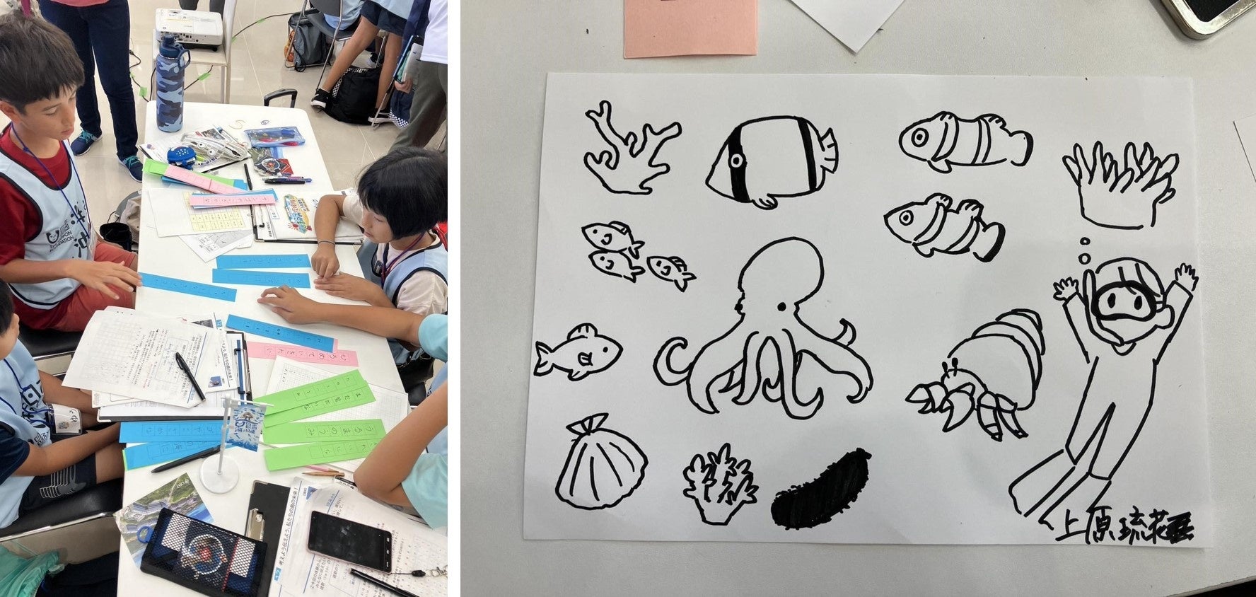 3日間で学んできた持続可能な沖縄の海の未来について皆で考えます。これまで学んだことを振り返りながらキーワードを書き出して皆で「琉歌」を作成します。それぞれのプログラムで体験したこと、感じたことから、周りに伝えたいメッセージを、琉歌(8・8・8・6)のリズムで言葉を考えます。前半の8・8で風景や出来事を、後半の8・6で心や気持ちや希望を表現します。各班に分かれて意見を交わしながら、合計11種の琉歌が生まれました。また、イラストをそれぞれ思い思いに描きました。絵が上手な子も多く、それぞれが感じたままに自由に海での出来事や体験したことを振り返りながらイラストにしていきました。琉歌で表現したメッセージと子どもたちが描いた魚のイラストをモノレール車両内ポスターに反映します。