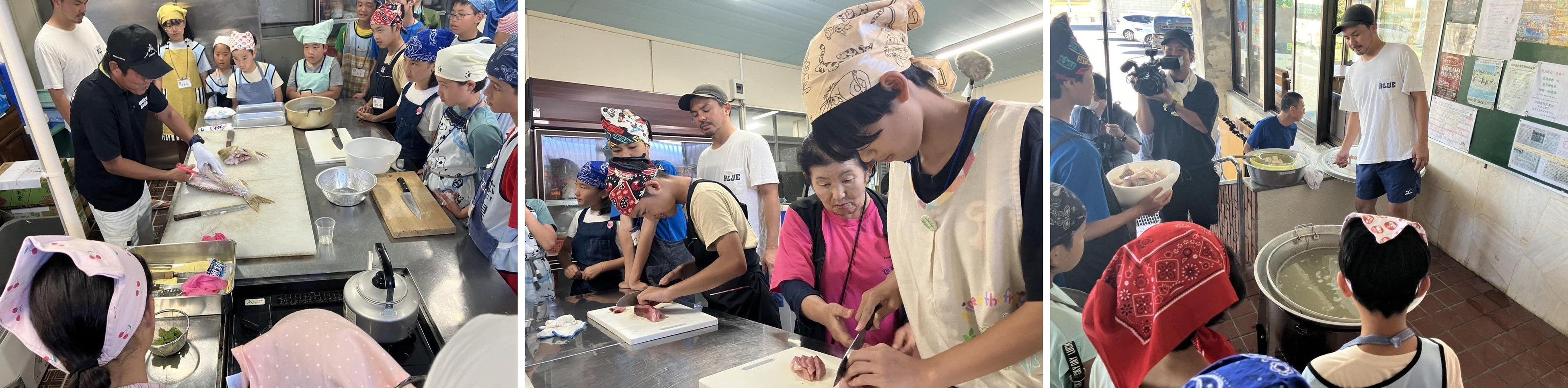 地元食材を使った調理体験をしました。地元漁師さんにまずは実演でさかなの捌き方を伝授いただきました。まぐろとタマン2種類を漁師さんが捌き、サクの状態から子どもたちが食べやすい大きさにカットし、あら汁と刺身でいただきました。あら汁は、前日お世話になった高江洲製塩所のお塩とお味噌を使用したシンプルだけど味わい深いお味でした!タコ漁で獲れたタコはお刺身でいただきました!