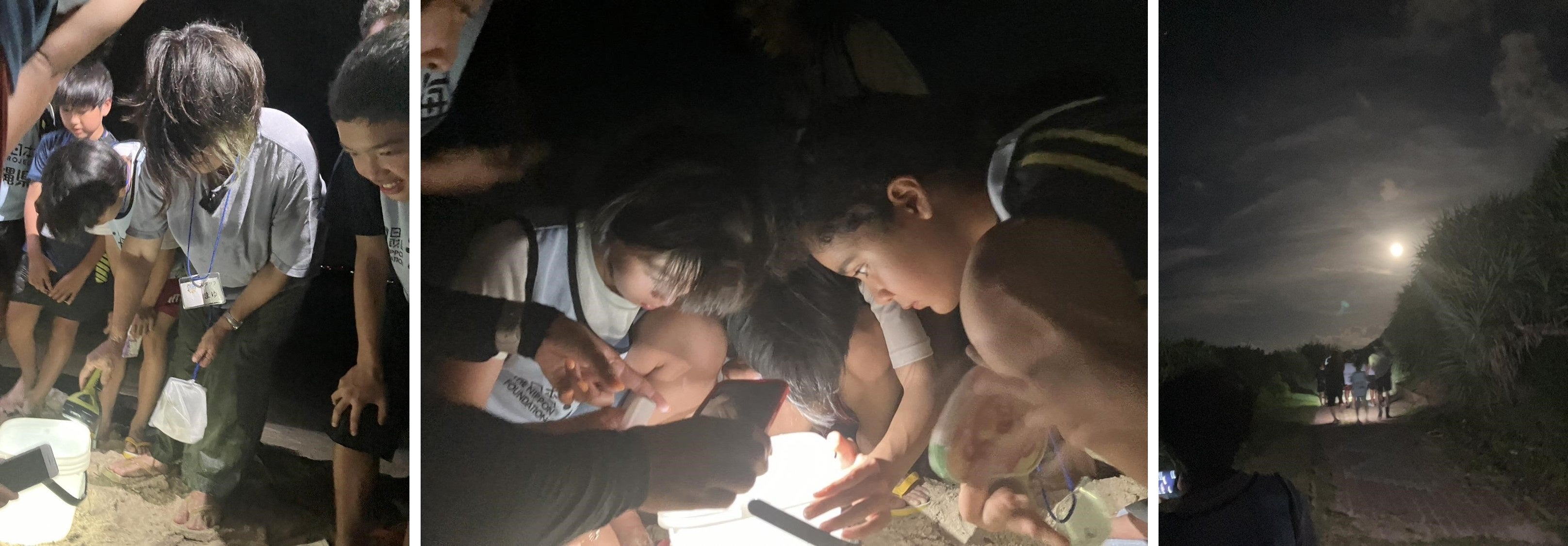 大潮の満月のこの日、月明かりが照らす中ヤドカリたちが卵を抱えて産卵に海に向かう姿がみられました!「どうして満月の日に?」という質問には、諸説あるようですが、干満の波の満ち引きが大きいことを利用して、卵をより広く海に放つことができることが理由として挙げられるようです。ヤドカリが産卵した直後の海水を採取し、視認できるプランクトンの観察ができました。