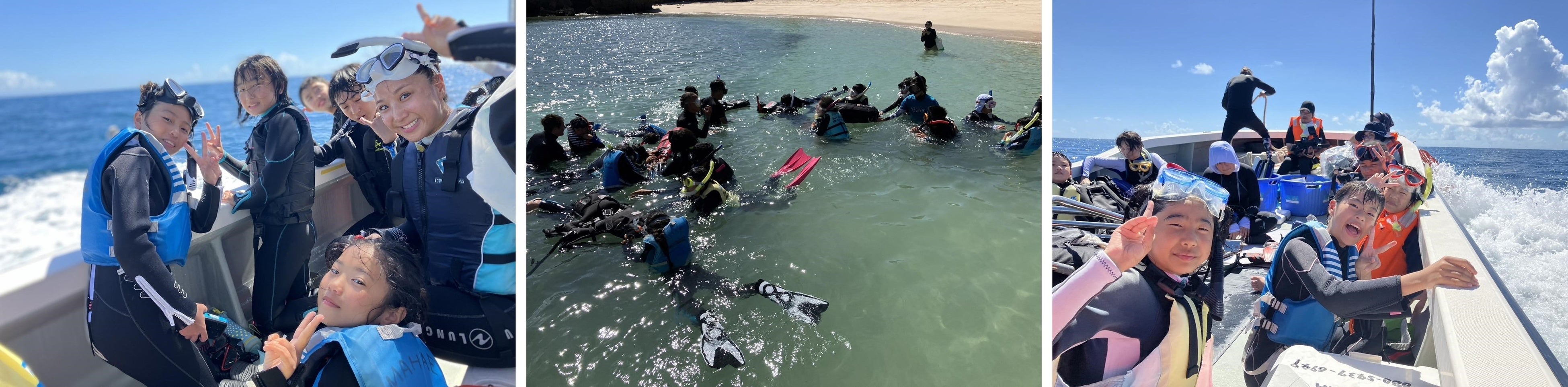 2日目の午前中は、シュノーケリングでサンゴの海を観察しました。シュノーケリングを初めて使う子もいたので、まずは浅瀬でマスクの付け方や呼吸の仕方、泳ぎ方を練習しました。最初は慣れない様子でしたが、だんだんと呼吸にもなれ、海中に広がる別世界に大興奮!サンゴをはじめ、浅瀬では見られない海中生物を観察しました。13種類のサンゴ移植が行われている海中も観察し、「透明度が高く、普段見ている沖縄の海じゃないみたい!」「海がきれいだった」「魚やサンゴがたくさんだった」など笑顔いっぱいの感想が聞かれました。