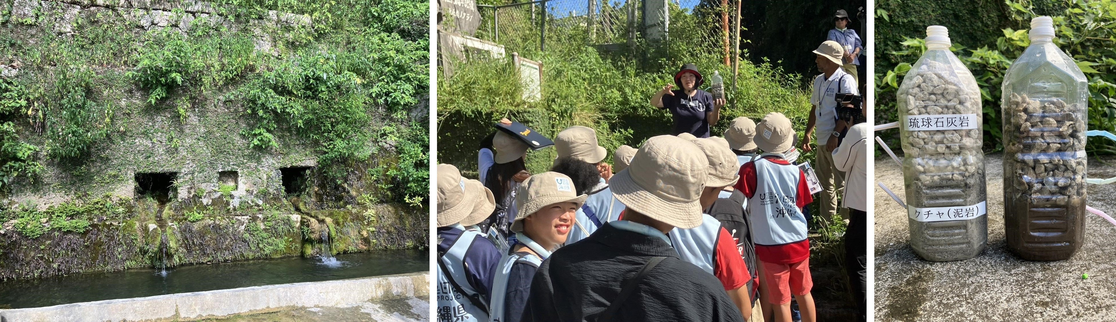 湧水を2ヶ所、ヤンガー(別名:マンガー)、ジョーグチガー(別名:ヒャクガー)と集落を散策しました。ヤンガーでは今でも水が湧き出ていて、真夏でも冷たい水が出ていました!琉球石灰岩の下に泥岩が重なりあうことで水が湧き出て、そうしてできた湧き水が宮城島には20ヶ所以上あります。自然を大切に暮らす宮城島の人々。「何千年もかけて地層が作られ、その資源として水を利用している私たち。開発によって自然を利用している私たちは決して無関心ではなく、考えていくことが大切であること。どう利用しながら、どう生かすのか考えよう」とメッセージをいただきました。