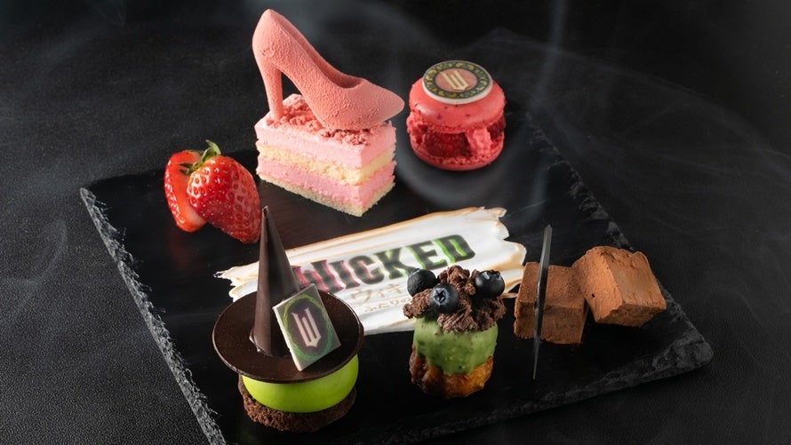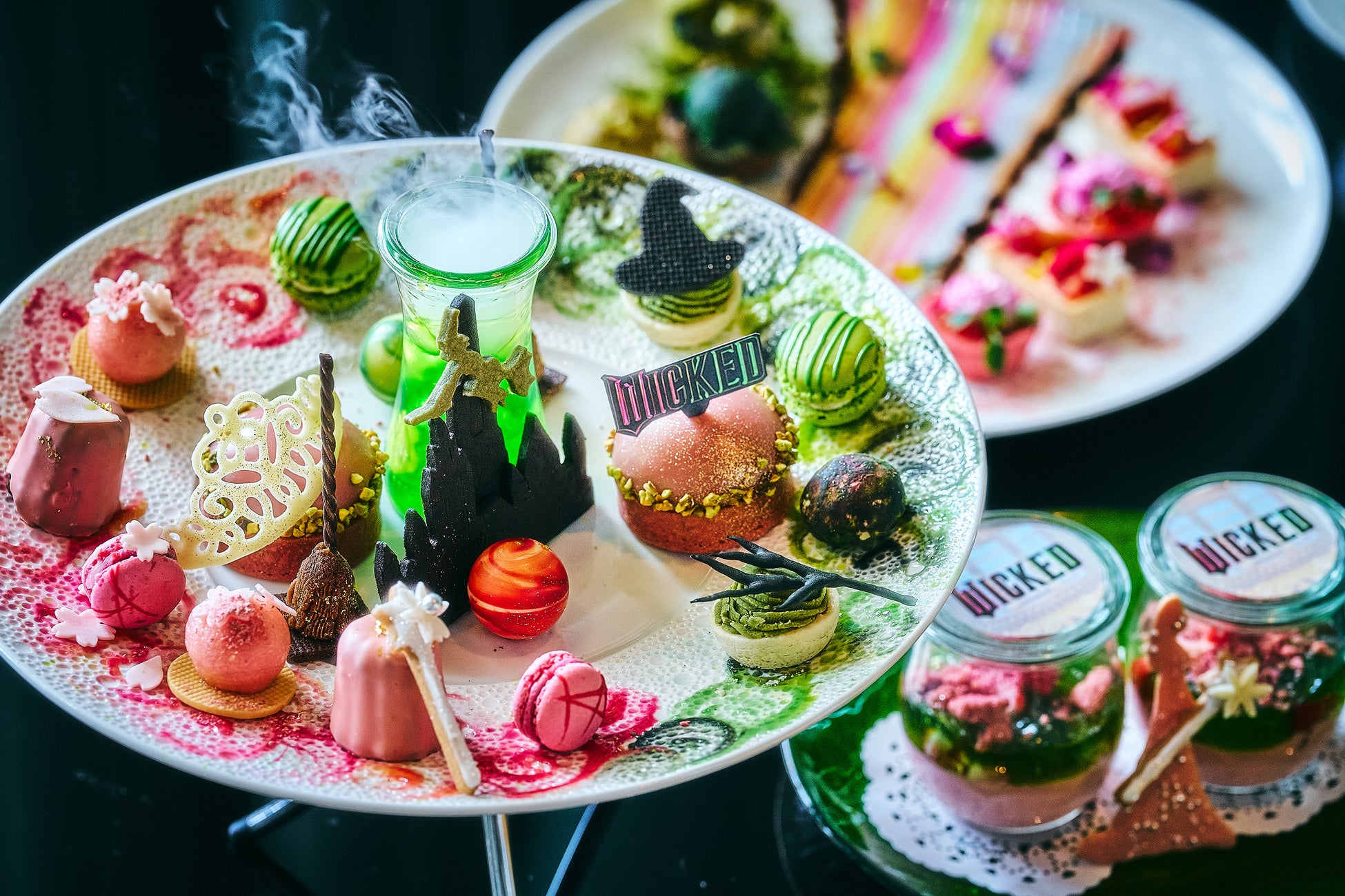 映画『ウィキッド ふたりの魔女』と春のアフタヌーンティーのコラボレーション。ピンクとグリーンカラーを中心に、作品の世界観を表現する色彩豊かなメニューをお楽しみいただけます。