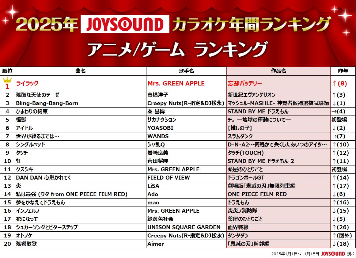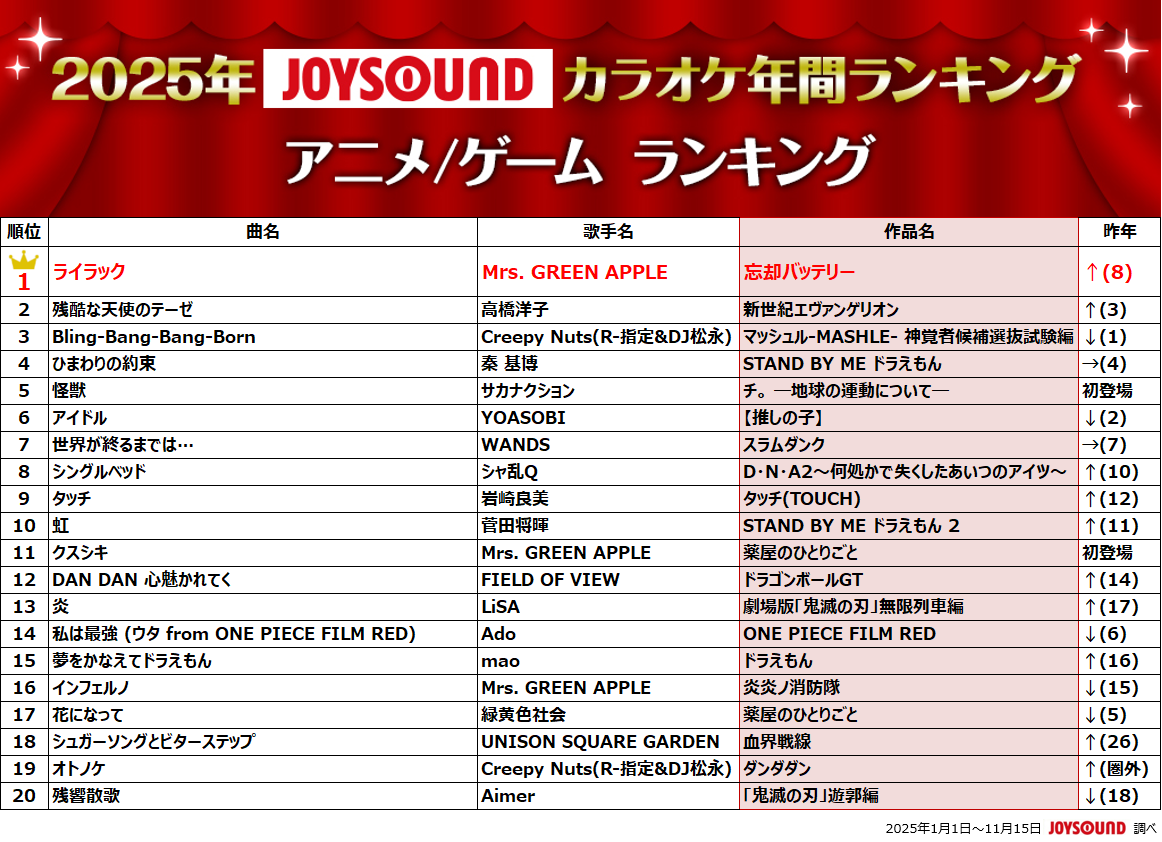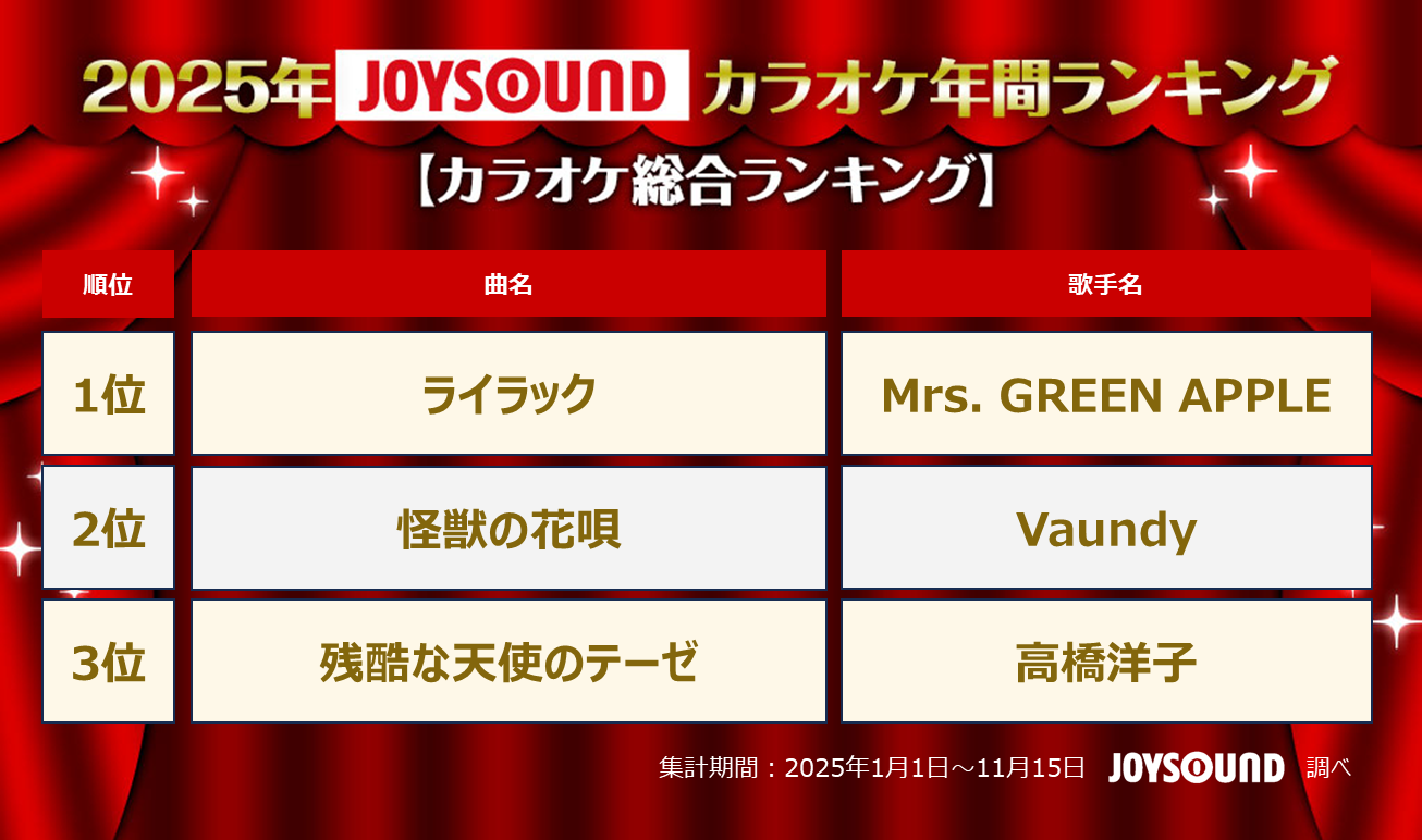 JOYSOUNDがカラオケ年間ランキングを発表!Mrs. GREEN APPLEが“四冠制覇”で2025年を象徴!NEWS、timelesz、CUTIE STREET、=LOVEも躍進!