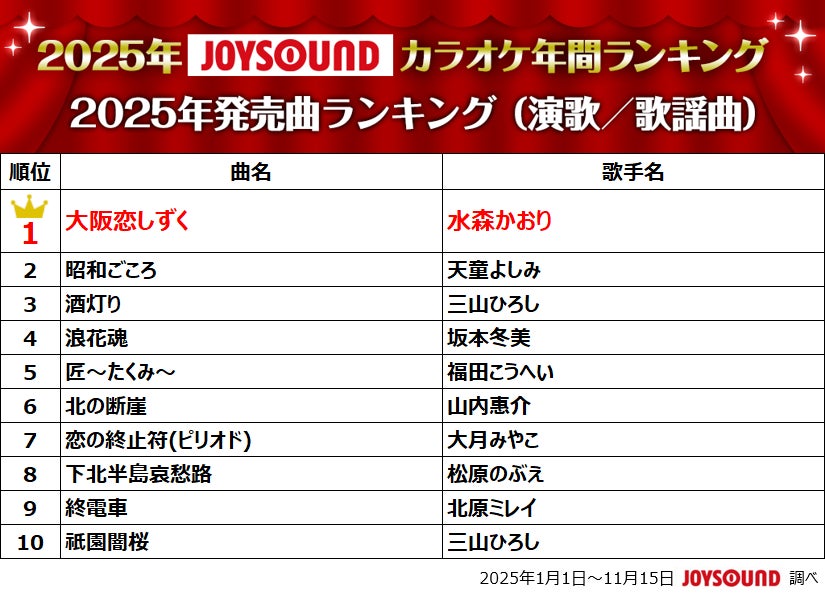 首位を獲得したのは、デビュー30周年を迎えたご当地ソングの女王・水森かおりの「大阪恋しずく」。人情と活気あふれる「大阪」の街を舞台に、二人で未来を歩む決意を描いた、しあわせ演歌が見事1位に輝きました。昭和の時代の人々の温かさや助け合いの精神をテーマにした、天童よしみが贈る応援歌「昭和ごころ」は2位を獲得しています。
