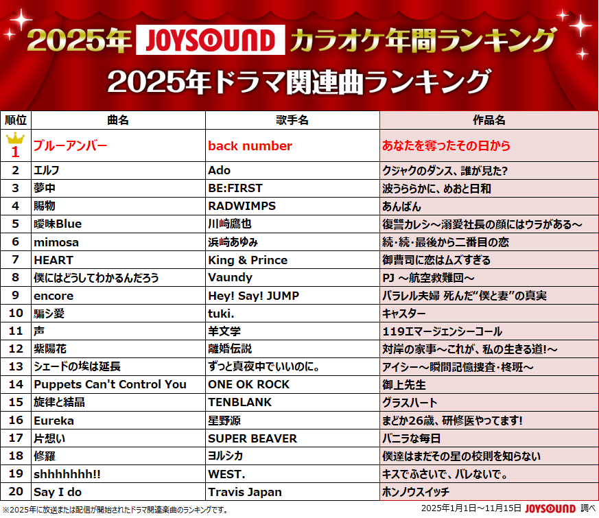 2025年に放送、配信されたドラマ関連曲ランキングでは、カンテレ・フジテレビ系月10ドラマ『あなたを奪ったその日から』の主題歌、back numberの「ブルーアンバー」が1位を獲得。ドラマとシンクロする切ない世界観が多くの共感を呼び、見事首位に輝きました。