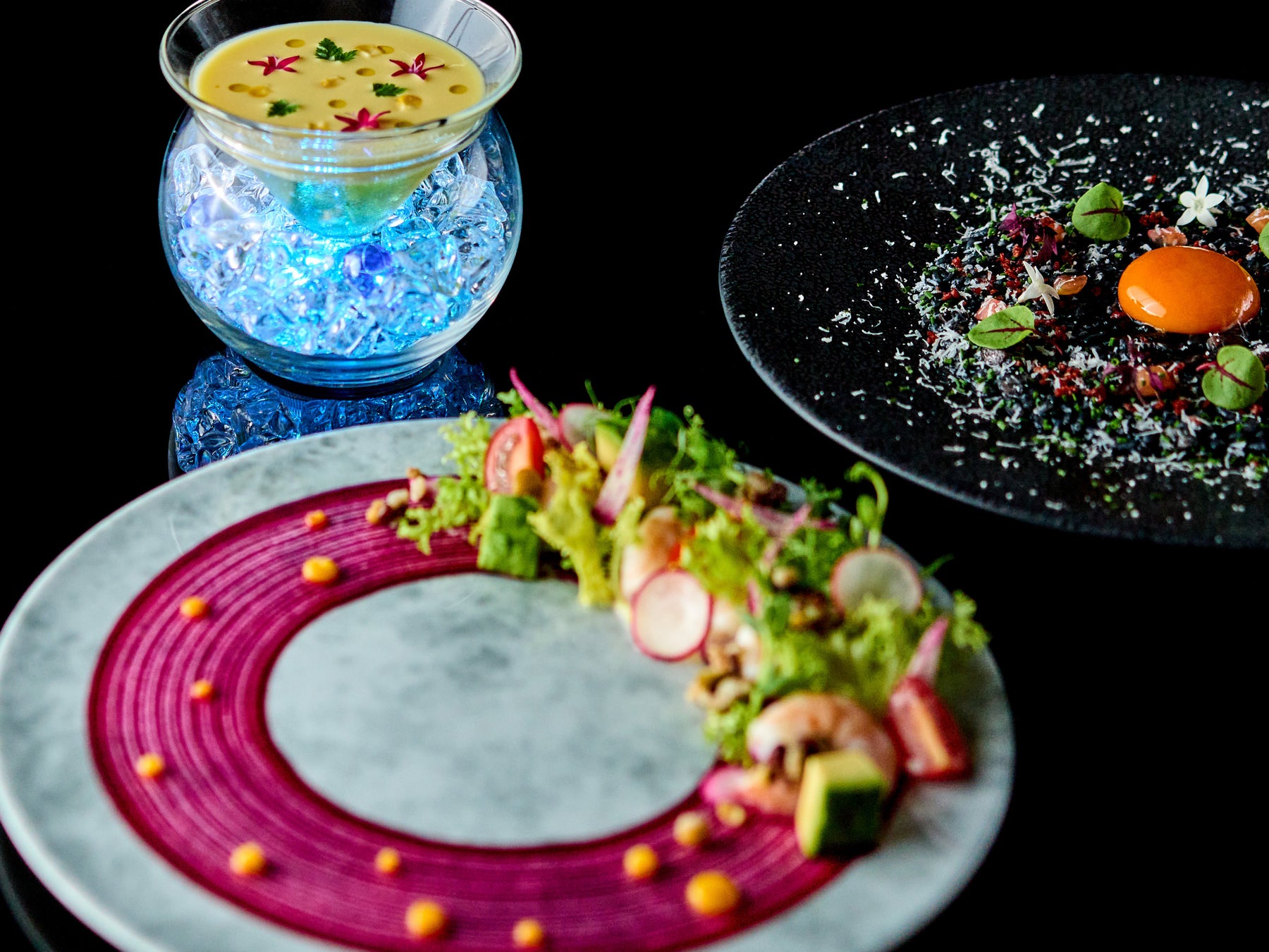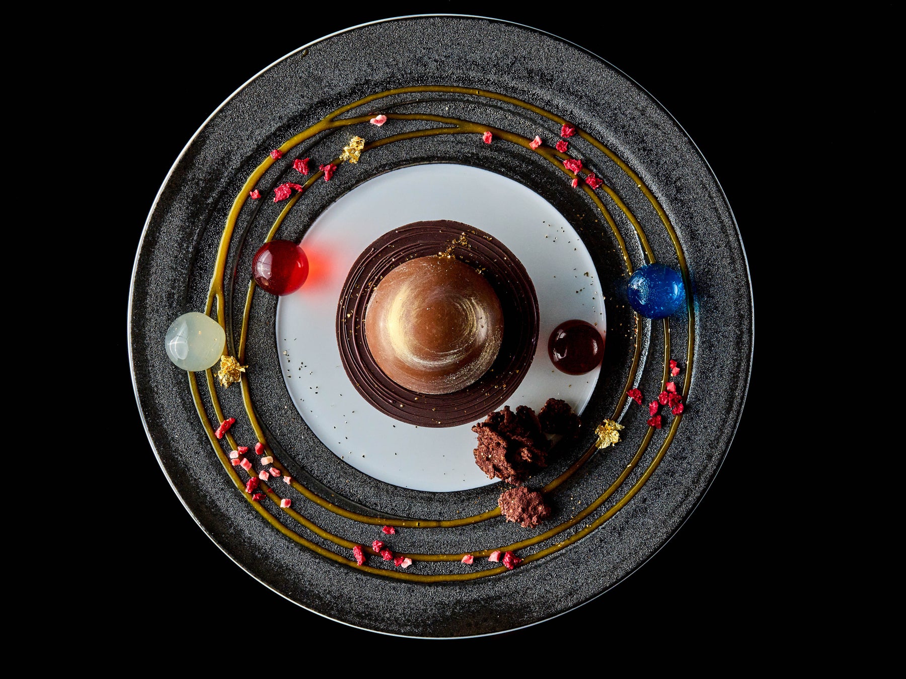 マンゴーのソースにフリーズドライのイチゴやフランボワーズを散りばめた、無限の宇宙を想起させるプレートの中央には、ベリーソースを忍ばせ土星を模ったチョコレートムース。高級ミルクチョコレート”ジヴァラ・ラクテ”を使用しており、コクのある甘味をお楽しみいただけます。周りのゼリーは惑星をイメージ。レモン、ストロベリー、紅茶、ブルーキュラソーの4色の寒天ゼリーです。土星と惑星は盛り付けずに創作パーツとしてお届けします。