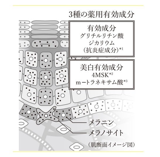 ○しっかり肌奥に届く2種の美白有効成分(4MSK※2、m-トラネキサム酸※3)がメラニンの生成を抑え、シミ・そばかすを防ぐ。
