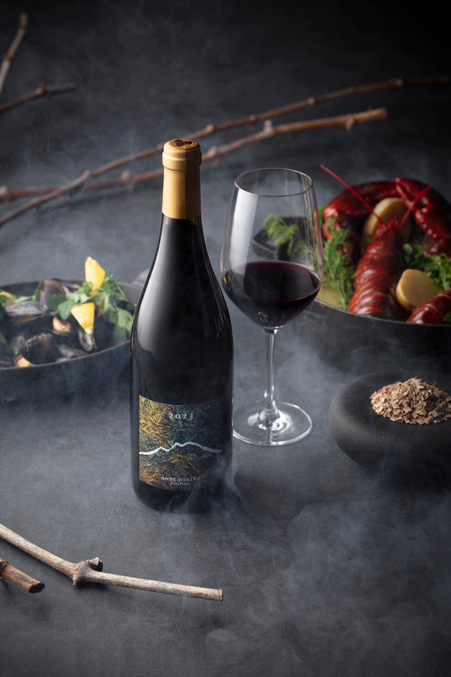 浅間山の麓に2023年10月開設した軽井沢アンワイナリーで醸造されたダークチェリーの香りとエレガントな味わいのワイン。ラベルは「越前和紙」をモチーフにした絵柄に「浅間山の稜線」を描いた、軽井沢在住「苔と和紙のアートデザイナー秋山えり氏」によるデザイン。