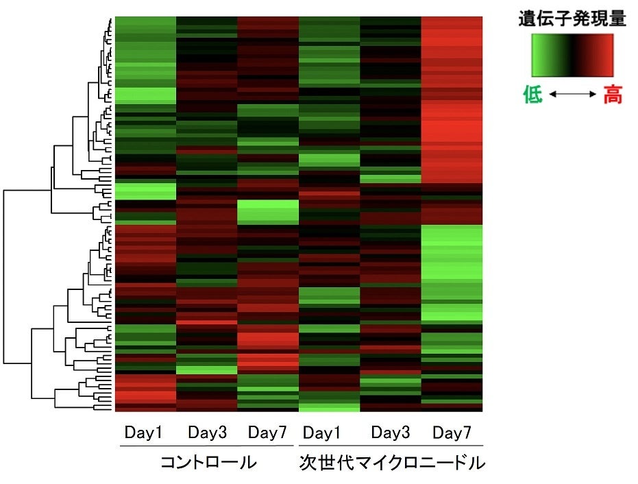 次世代マイクロニードルの「押す」効果は、皮ふ深部に圧縮刺激を与え、即時的に血流を促進することが明らかになりました。また、次世代マイクロニードルを2日に1回の頻度で7日間使用し、皮ふ深部に刺激を与えることにより、免疫・血管・コラーゲンなどの細胞外マトリクスに関連する遺伝子群の発現を変化させ、皮ふを傷つけずに肌改善を促すことが示唆されました(図4)。