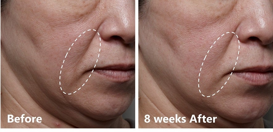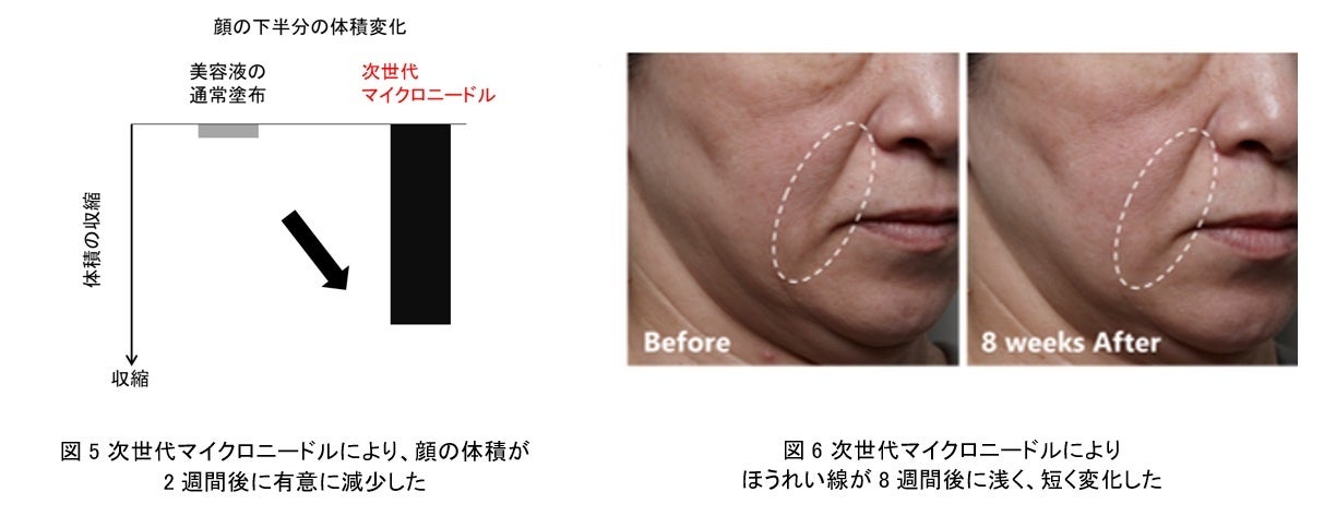 ナイアシンアミドを配合した次世代マイクロニードルにて連用試験を実施した結果、通常の塗布と比較して、より短期間でのしわ・透明感の改善が認められました。また、顔の下半分の体積変化の評価を行った結果、次世代マイクロニードルにおいて、2週間後に顔の下半分の体積が有意に減少しました(図5)。また、たるみグレードの有意な改善を確認し、8週間後にほうれい線がより浅く、短くなっていることを確認しました(図6)。加えて、経表皮水分蒸散量(TEWL)を評価した結果、次世代マイクロニードルは、バリア機能を破壊せず、むしろ、バリア機能を改善することが明らかとなりました。