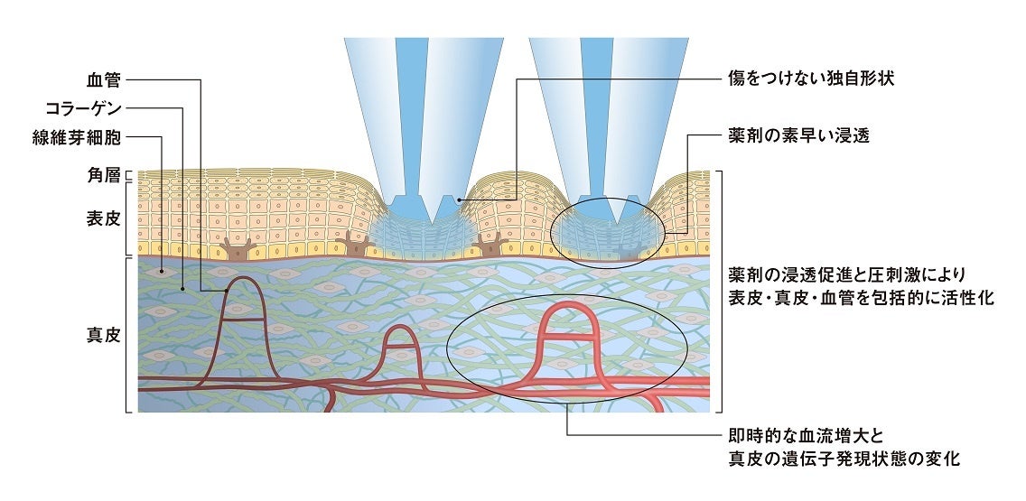 ※2 マイクロスケールの超微細な針。角層に極小の穴をあけることで、薬剤の皮内送達や細胞の賦活化を促す手法として、化粧品・医療分野での活用が進んでいる