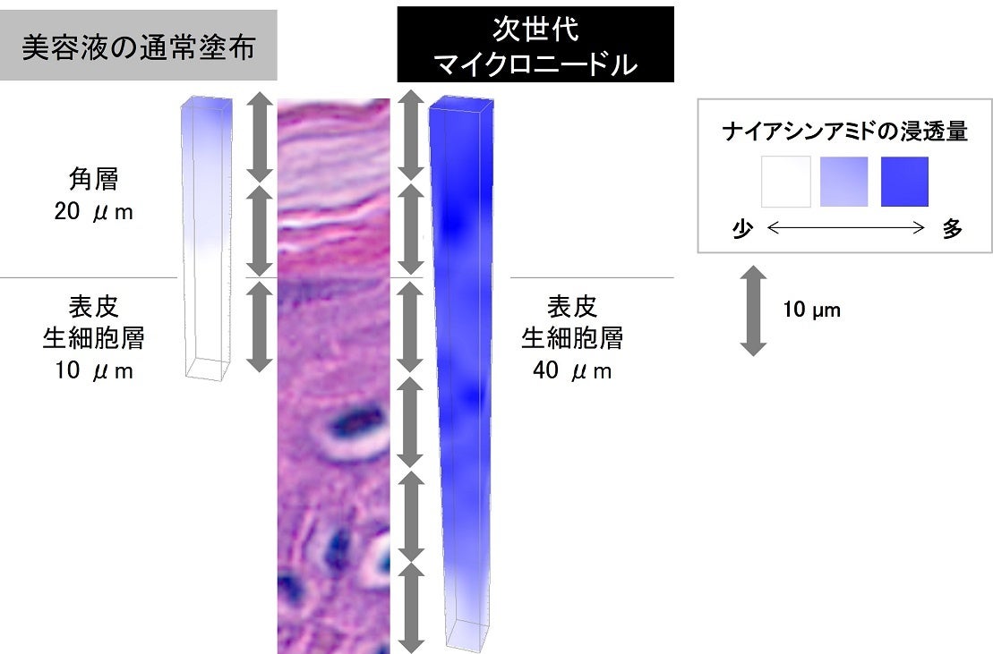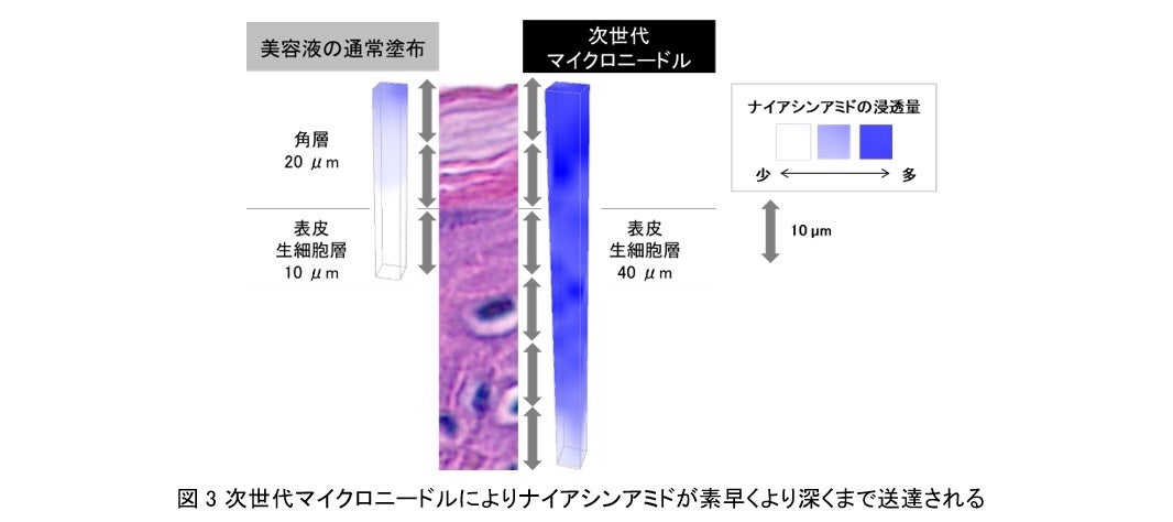 種々形状のマイクロニードルを検討した結果、皮ふ浅層のみを精密に刺し、同時に皮ふ深部に押圧による圧刺激を効率的に与えることのできる形状パラメーターを見出し、最適化された形状の次世代マイクロニードルを開発しました。開発した次世代マイクロニードルは皮ふに薬剤を注入することが可能であり、薬剤の浸透性を評価した結果、ナイアシンアミドなどの水溶性薬剤の浸透量を有意に向上させるとともに、素早くより深くまで送達させることを明らかにしました(図3)。