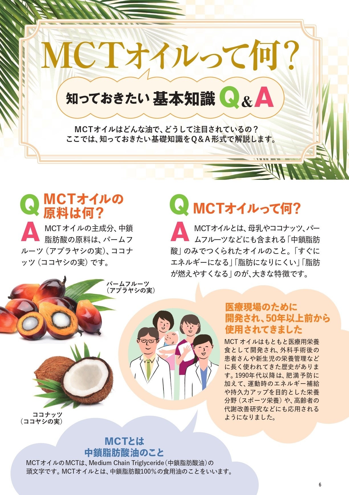 それが、「MCTオイル(中鎖脂肪酸100%の食用オイル)」です。中鎖脂肪酸は、ココナッツやパームフルーツ、母乳などにも含まれる天然成分。一般的な油の成分(長鎖脂肪酸)と比べて、吸収・代謝が約4倍速く、摂取後すぐにエネルギーに変換されます。そのため体脂肪になりにくいのが特徴です。