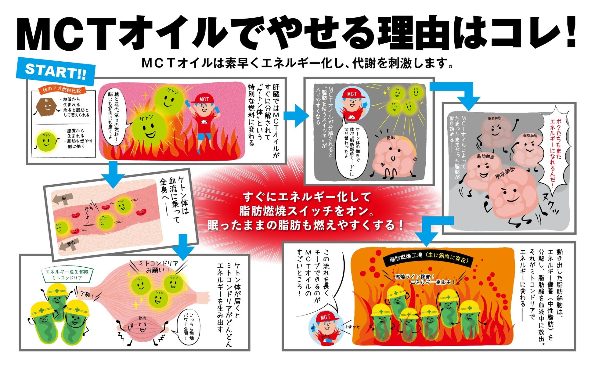 そして、すでについている体脂肪にも作用し、エネルギー化しやすくする働きももっています。さらに、吸収されたMCTオイルの一部は、腸を動かすホルモン「グレリン」の働きを助け、排便を促し、吸収されなかった一部のMCTオイルは、大腸で潤滑油として作用。便のすべりをよくすることも明らかになっています。