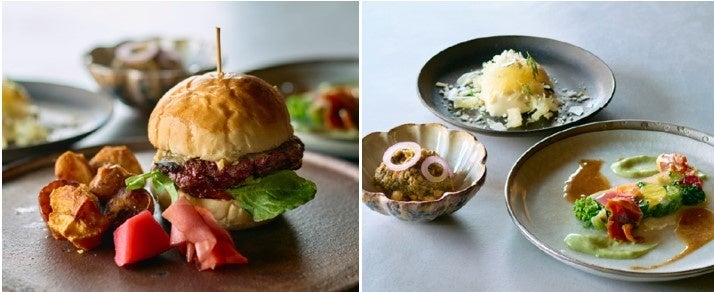 〈コース内容〉美山鹿のハンバーガー、大原野菜のテリーヌと小浜のへしこ、大原野菜のミネストラ、ふきのとうのパンナコッタ