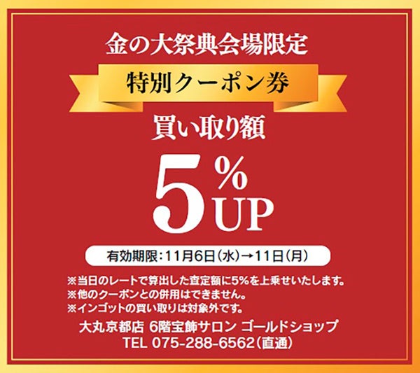 金の大祭典会場内では期間中に「金・プラチナ製品の買い取りコーナー」を設置し、ご不要の地金・ネックレス・ブレスレット・指輪など(金・プラチナ製品)を、当日の相場で計算し、その場で現金にて買い取りいたします。