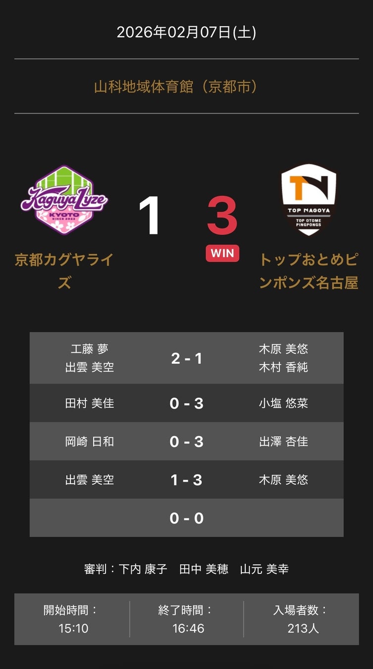 ノジマTリーグ 2025-2026シーズン 公式戦 2月7日開催 京都カグヤライズ vs トップおとめピンポンズ名古屋 試合結果