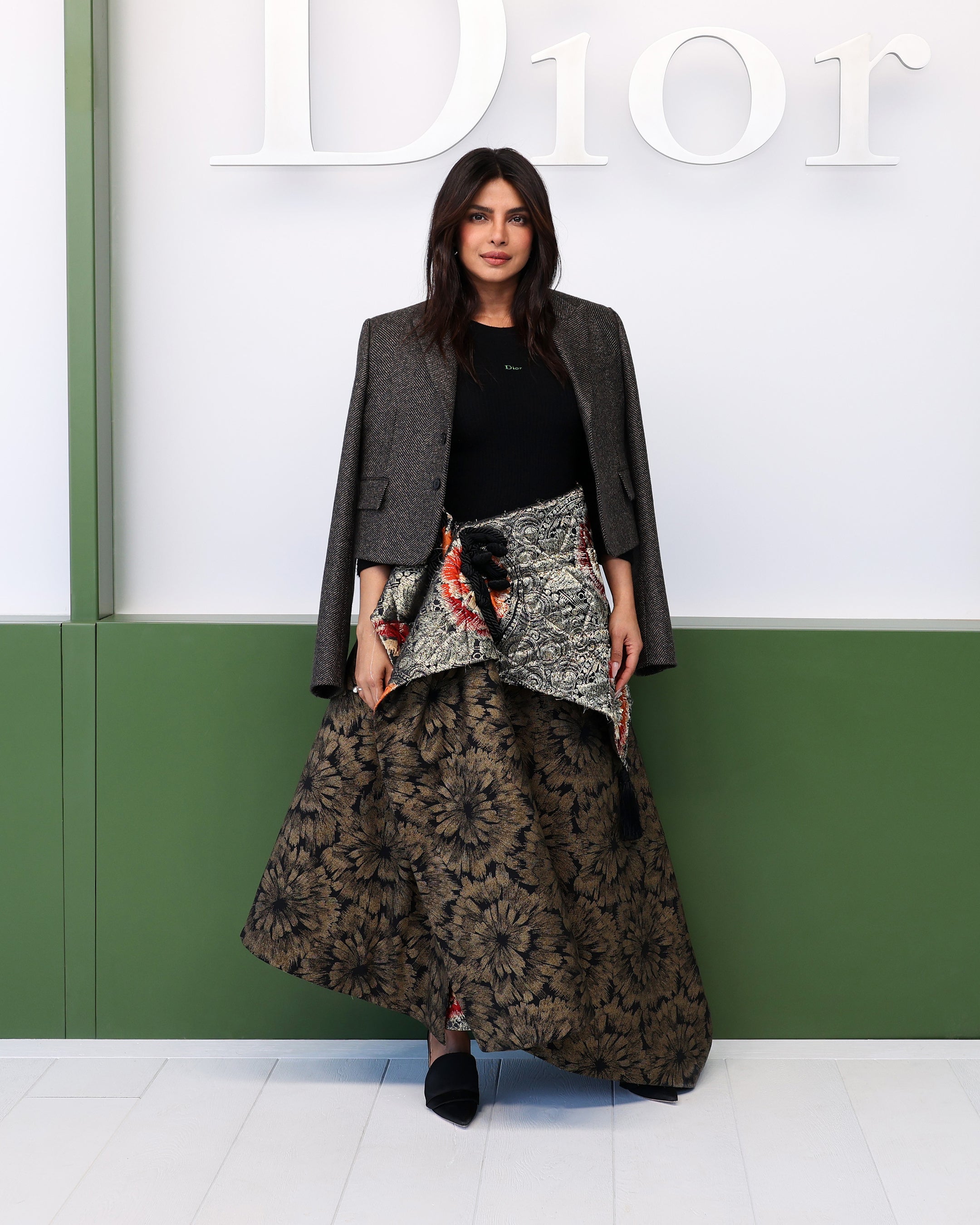 プリヤンカー・チョープラーは、ブラックのコットントップスとカラフルなプリントシルクスカートの上に、グレーのウールジャケットを着用しました。