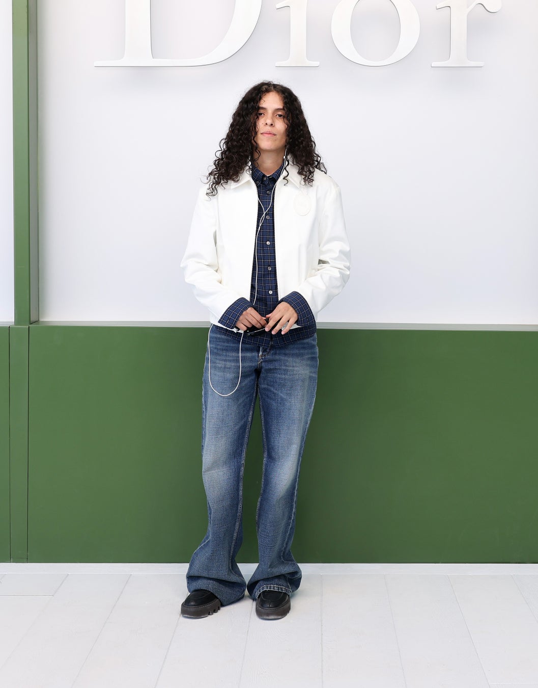ロバート・アラマヨは、シアリングカラーをあしらったカーキのフィールドコートと、ブルーのコットンチェックシャツ、ブルーのデニムジーンズを着用し、ブラックレザーの「ディオール アーチー」ローファーを合わせました。