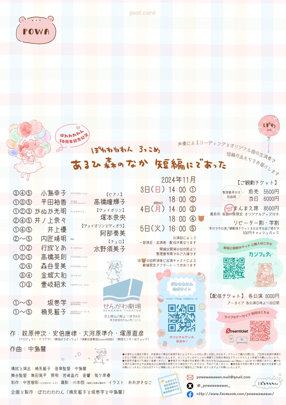 声優によるリーディングと作品にあわせたオリジナル曲の生演奏で短編作品たちをお届けするリーディングユニット「ぽわわわわん」の、旗揚げ10周年記念公演です。