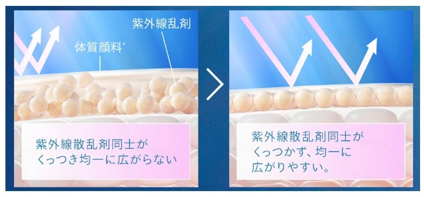 軽さのある紫外線散乱剤と表面加工処理剤の工夫により、紫外線散乱剤が少なくて済むため、高SPFでも白浮きせず、軽い付け心地を実現。