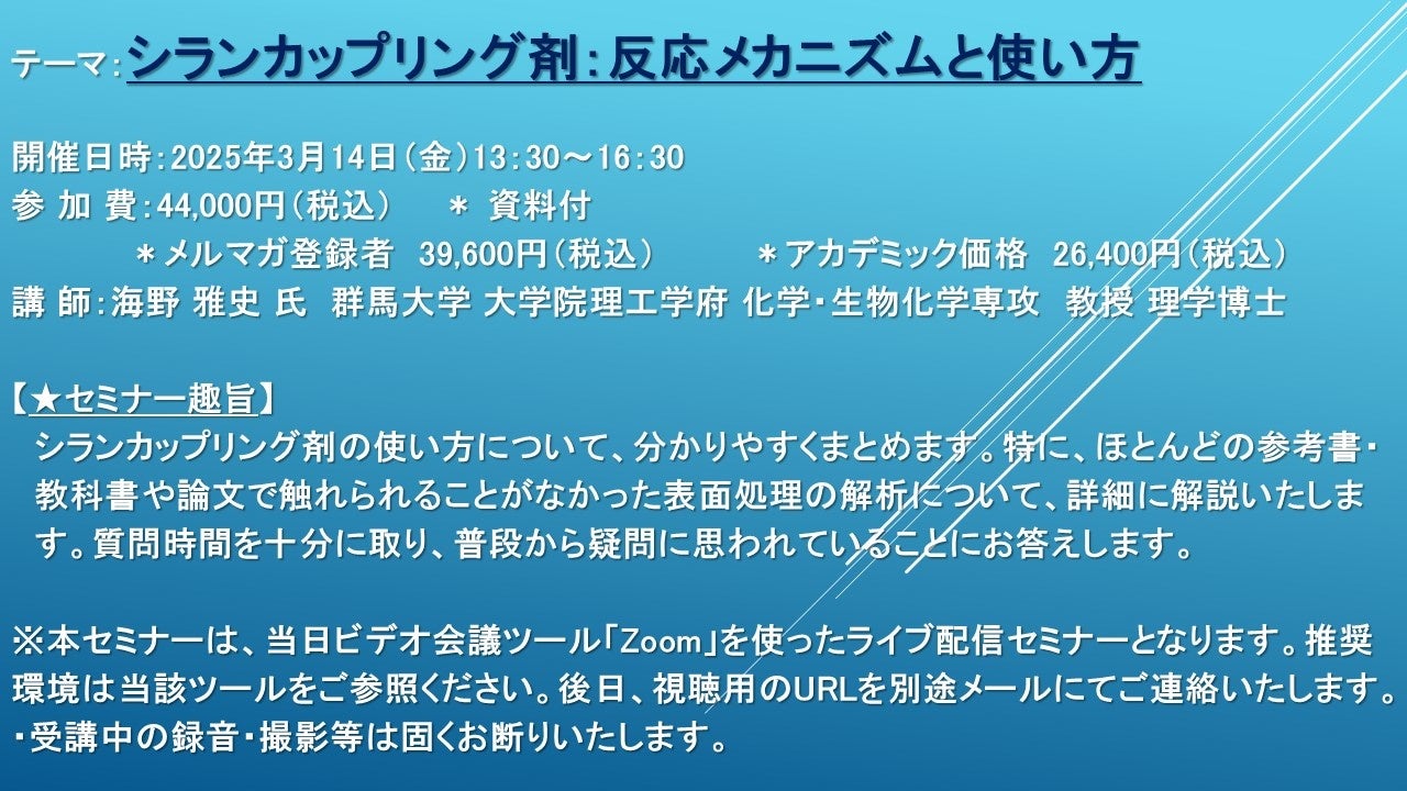 【ライブ配信セミナー】シランカップリング剤:反応メカニズムと使い方 2025年3月14日(金)開催 主催:(株)シーエムシー・リサーチ