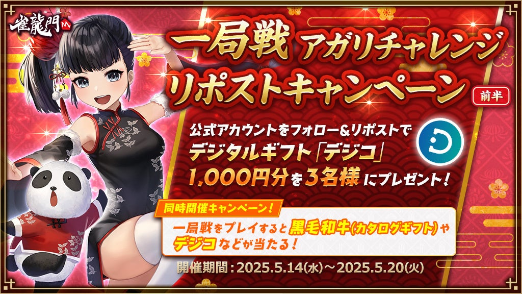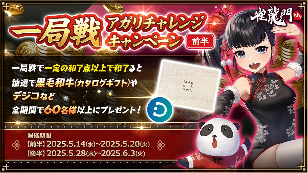 エヌ・シー・ジャパン株式会社(本社:東京都港区、代表取締役:林 元基(イム ウォンキ)、以下エヌシージャパン)は、PCとスマートフォン向け超美麗本格3D麻雀ゲーム『雀龍門M』にて、2025年5月14日(水)より「一局戦アガリチャレンジキャンペーン<前半>」および、SNSキャンペーンの開催をお知らせします。