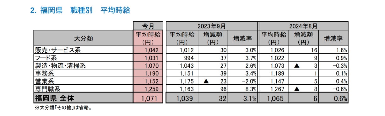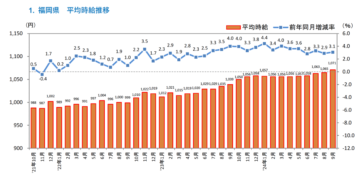 ■ 福岡県の平均時給は1,071円(前年同月1,039円、前月1,065円)
