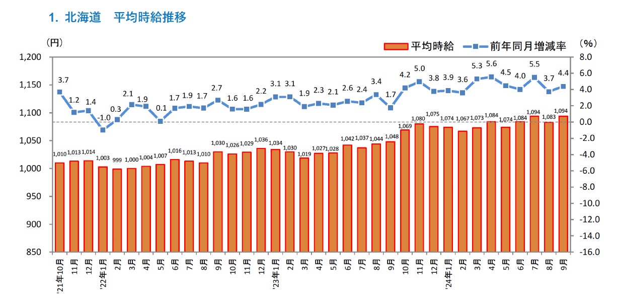 [北海道版]2024年9月度 アルバイト・パート募集時平均時給調査 北海道の9月度平均時給は前年同月より46円増加の1,094円